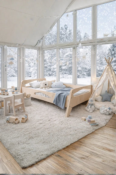 Zeni Montessori Floor Bed with Cylindrical Railings This model is available in three different railing heights — 17", 19", and 23" — allowing you t...